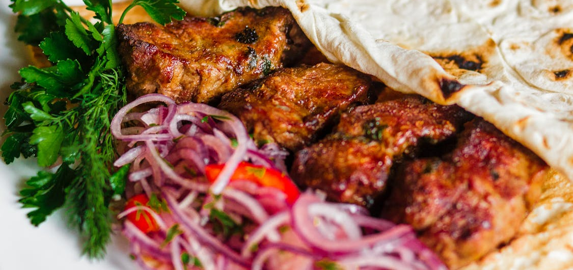 Warm the pita bread or lavash in a dry skillet or microwave. Lay the bread flat and layer with slices of grilled meat, tomatoes, onions, and lettuce.